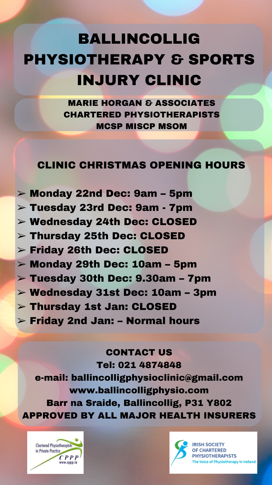 As a practice owner/manager she seeks to provide a competitive cost effective quality service responsive to the diverse needs of those seeking her guidance and assistance. Currently the practice is accredited with all of the health insurance companies providing healthcare cover in Ireland. Uniquely, from mid 2012 the clinic is one of a limited group of Practices nationwide delivering the Irish Life "Back-up" programme.